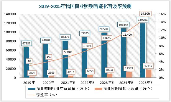而在智能照明應用領域中,工商業智能照明應用占比高達57.21%,市場前景可觀。據數據顯示,2020年,我國商業照明行業空間數量為74,070萬個,其中商業照明智能化數量為2,963萬個,智能照明在商業照明領域滲透率為4.0%。預計到2025年,商業照明智能化滲透率將達到14.9%。