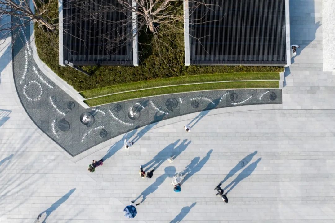 景觀內容的選擇上,三面云山的樹陣表達,圓形廣場的西湖水,以及在邊界處長紋綠整石構建的連續臺地,荷葉連連水景以及散落櫸樹下的藝術坐石,整體上去實現小場景-大氣象,小細節-大文化,小空間-大杭州。