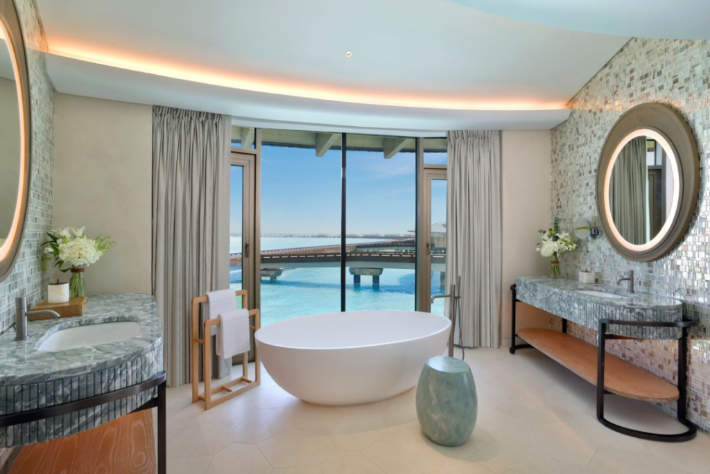 所有的獨棟別墅都配有私人游泳池和落地窗,阿拉伯灣的水域、奇幻沙漠景觀、壯麗的山脈一覽無遺,營造出一種超現實的沙漠浪漫氛圍。