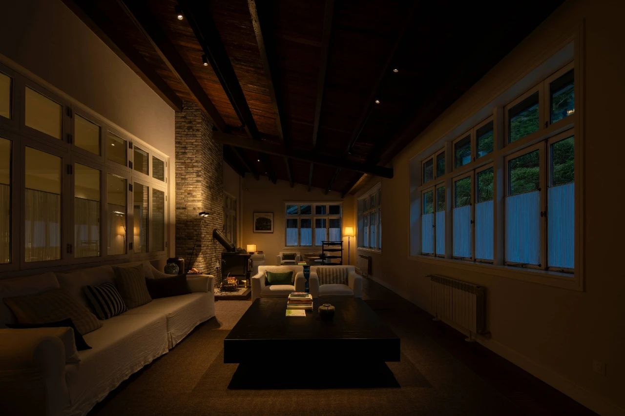 室外照明部分,通過(guò)調(diào)整景觀燈光源參數(shù),顯著降低了鳥瞰視角下的低位眩光;同時(shí),在門廊區(qū)域創(chuàng)新性運(yùn)用入戶燈具,以光影層次烘托山居意境,踐行“暗天空”理念。項(xiàng)目通過(guò)以下設(shè)計(jì)手法實(shí)現(xiàn)自然與功能的平衡: