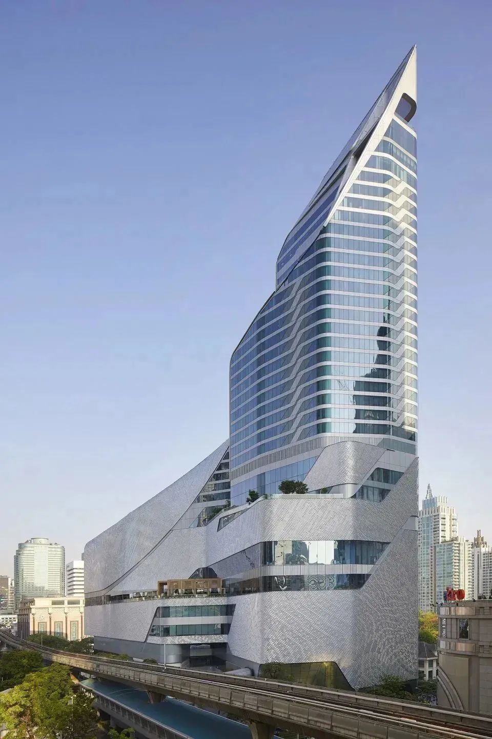 兩個(gè)零售綜合體的建筑靈感來(lái)源于與湄南河相關(guān)的文化價(jià)值觀和信仰,暹羅天地?(ICONSIAM) 大廈是一個(gè)高度現(xiàn)代化的建筑,模仿了蕉葉燈籠折疊的方式,將傳統(tǒng)的泰國(guó)設(shè)計(jì)變成現(xiàn)代化的意思。
