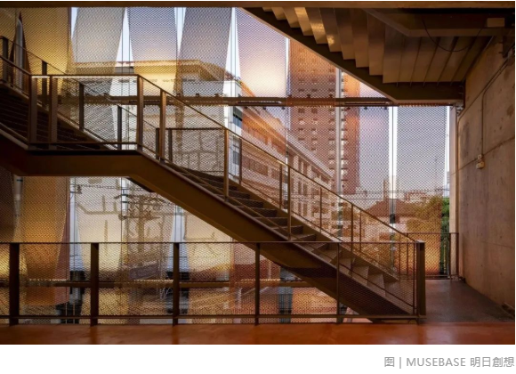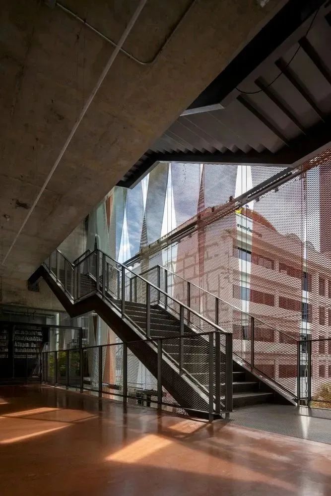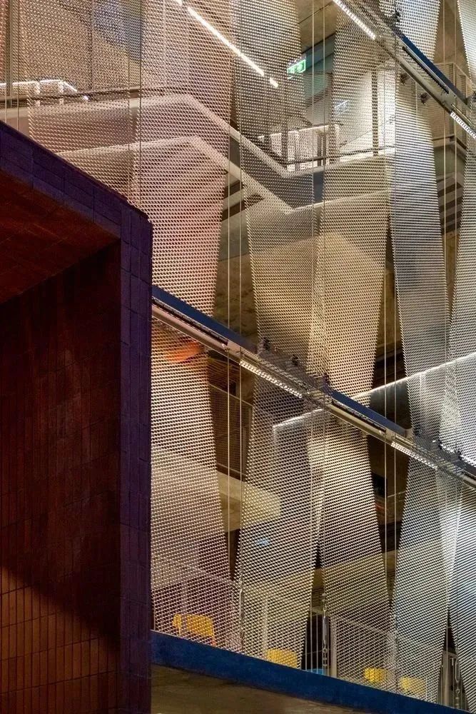 建筑師在上層立面上安裝了一層薄薄的鋼網(wǎng),一定程度上消解不同商店之間的差異,創(chuàng)造了一個(gè)輕盈而又統(tǒng)一的建筑外觀。同時(shí),這層鋼網(wǎng)滿足了通風(fēng)需求,并且讓室內(nèi)外之間可以進(jìn)行視覺交流。